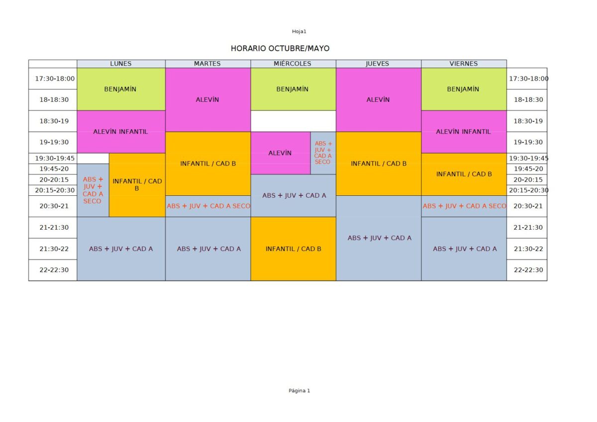 BENJAMÍN 16h / ALEVÍN 16h / INFANTIL 12:15 / CADETE A 11:15h (B) y 17h / JUVENIL 10:15h / ABSOLUTO 18:15h